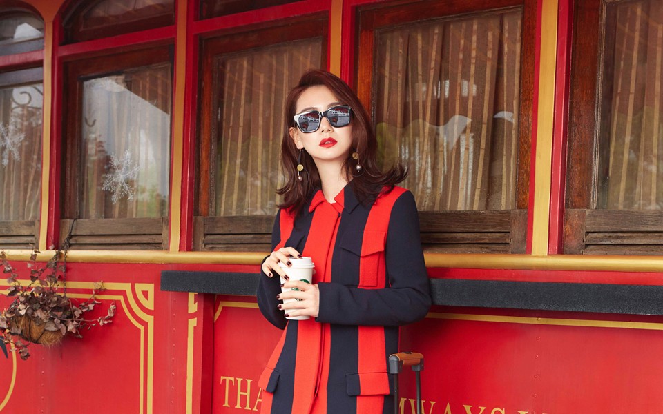 戚薇身影在都市背景下显得独立而耀眼,经典的红唇墨镜组合诠释着永不过时的摩登型格