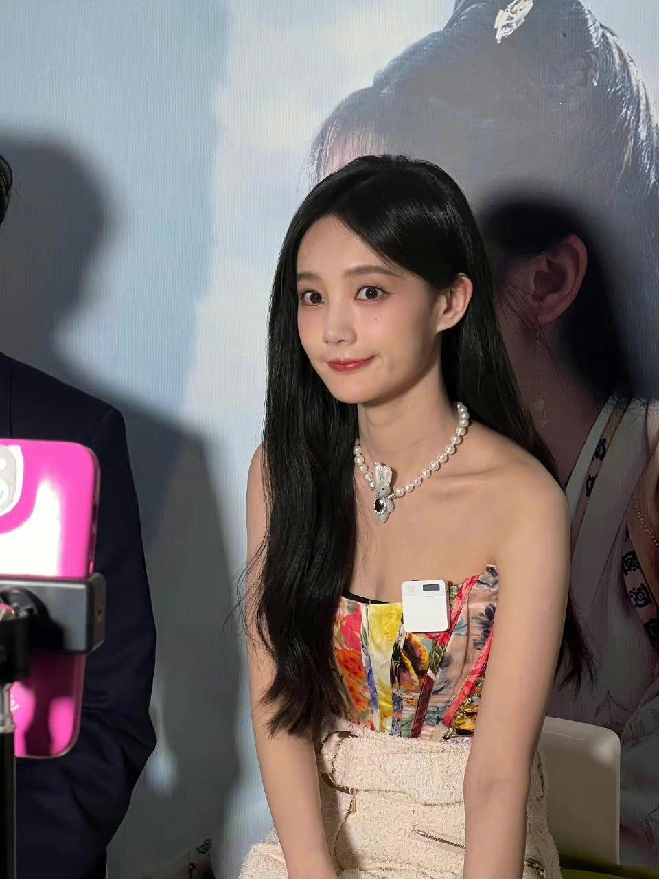 李一桐展露灵动俏皮笑容,眼角弯弯梨涡浅现,尽显甜美气质